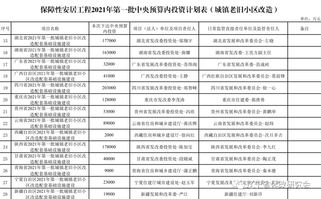 以下为《通知》全文及附件 国家发展改革委 住房城乡建设部关于下达保障性安居工程2021年第一批中央预算内投资计划的通知 发改投资〔2021〕198号 有关省、自治区、直辖市及计划单列市发展改革委、住房城乡建设厅(住房城乡建设委、建设和交通委、建设局): 为加强保障性安居工程配套基础设施建设,根据《政府投资条例》(国务院令第712号)、《中央预算内投资补助和贴息项目管理办法》(国家发展和改革委员会令2016年第45号)和《中央预算内投资保障性安居工程专项管理暂行办法》(发改投资规〔2019〕1035号),现将保障性安居工程2021年第一批中央预算内投资计划2969300万元以投资补助方式切块下达你们,用于支持城镇老旧小区改造和棚户区改造配套基础设施建设,并就有关事项通知如下: 一、项目实施 请严格按照有关规定,认真组织实施,加强项目管理,严格按照批准的项目名称、建设内容、建设规模以及下达的中央预算内投资进行建设,严禁将中央预算内投资截留、挤占或挪作他用,项目建设所需其他资金要确保足额及时到位。严禁未经批准擅自变更建设内容和建设规模,如确需调整,须按权限报有关机关批准。项目建设内容和规模调整影响中央预算内投资安排规模的,应及时报国家发展改革委进行调整。 要加强对保障性安居工程配套基础设施项目的审核,原则上不得安排用于城市主干道主管网、综合管廊、城市广场、城市公园等项目,不得安排用于地方各项建设资金未落实、规定时间内无法开工建设的项目;要符合本地区财政承受能力和政府投资能力,切实防范地方政府债务风险和金融风险。安排保障性安居工程配套基础设施建设项目时,中央预算内投资要重点支持项目排水防涝设施内容,要统筹考虑支持消除污水收集空白区,完善“一城一策”“一区一策”消防车通道治理方案。同时,要切实落实项目建设条件,重点安排因配套基础设施短板影响群众使用的项目;对审计、督查发现存在问题多、整改不到位的市县,要减少安排中央预算内投资。 二、分解下达 请在收文后30个工作日内将投资计划分解落实到具体项目,及时上报备案并在国家重大建设项目库中相应分解至具体项目。要按照《政府投资条例》有关规定明确安排方式,已安排中央财政资金的项目不得重复支持。在分解投资计划时,要加大对“三区三州”和革命老区等特殊地区倾斜支持力度;要对地震易发区加大支持。有关项目应符合《中央预算内投资保障性安居工程专项管理暂行办法》和《关于申报2021年城镇老旧小区改造计划任务的通知》(建办城〔2020〕41号)、《关于申报2021年城镇棚户区改造公租房保障计划任务的通知》(建办保〔2020〕52号)明确的支持范围。计划新开工项目应有扎实的前期工作基础、具备开工条件,在建项目各项建设手续应当完备,确保投资计划分解后,下达投资能够立即投入项目建设。 对分解后的具体项目应逐一落实项目(法人)单位及项目责任人、日常监管直接责任单位及监管责任人,并经日常监管直接责任单位及监管责任人认可。各地要按照国家有关规定,建立部门间衔接机制,在项目申报、资金安排过程中严格做好信用信息审核,确保资金使用管理规范。 三、加强监管 项目单位要严格落实投资计划执行和项目监管的主体责任。项目单位应当按要求签署综合信用承诺书,积极开展项目前期工作,严格按批复组织项目建设,及时准确上报进度数据和信息,如期保质保量完工投用。自觉接受各级监管部门和监管责任人的监督检查。对监管部门指出的问题要积极整改,并及时向有关部门报送整改情况。 日常监管直接责任单位要严格落实投资计划执行和项目实施日常监管直接责任。日常监管直接责任单位中的监管责任人应随时掌握项目建设情况,做到“三到现场”,即开工到现场、建设到现场、竣工到现场,并及时主动向上级相关部门报告。 按照省级人民政府负总责、市县人民政府负责实施和监管的要求,各地要建立保障性安居工程中央投资项目上下联动、分级负责的监管机制,切实履行监管职责。省级发展改革应会同住房城乡建设(房地)部门,按照隶属关系加强对市县有关部门的督促指导,强化本行政区域内项目的监管,特别要发挥基层发展改革部门和行业管理部门就近就便监管的优势,压实“两个责任”,努力做到问题早发现、早解决,避免等到审计、督查发现问题才去解决。要建立工作机制,制定监管计划,组织实施中央预算内投资项目的日常调度、在线监测、现场检查和监督问责。国家发展改革委、住房城乡建设部将加大监督检查工作力度,适时对计划执行情况进行抽查,重点检查项目管理、资金使用、施工进度、工程质量等。对于投资计划执行不力的项目,将按照有关规定,对有关单位和相关责任人员实施处罚。 四、按月调度 列入本批计划的项目,均纳入国家重大建设项目库监管体系,请有关方面严格做好项目信息数据填报和审核工作,提高填报数据质量。请于每月10日前将本批计划项目开工情况、投资完成情况、工程形象进度等数据通过国家重大建设项目库报送国家发展改革委(涉密项目按有关要求报送)。国家发展改革委将对所有项目实施在线监测,定期对本批项目进行综合评价,在一定范围内公开评价结果,并作为后续投资安排的重要参考。国家发