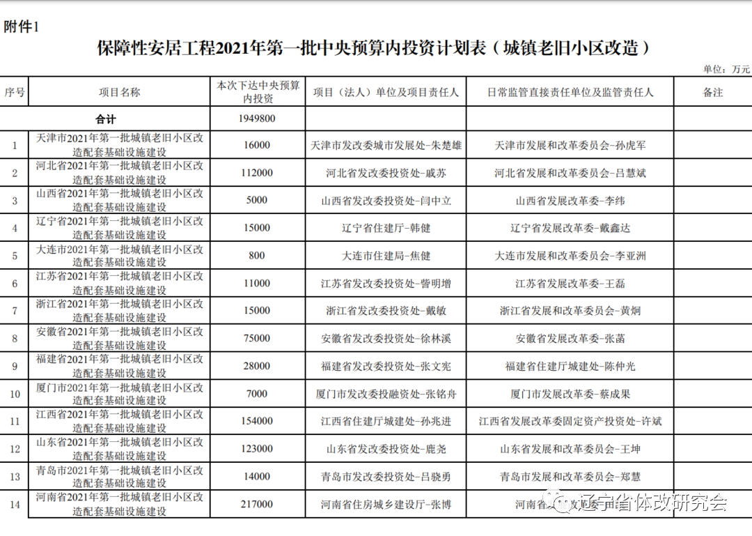保障性安居工程2021年第一批中央预算内投资计划表(城镇老旧小区改造)
